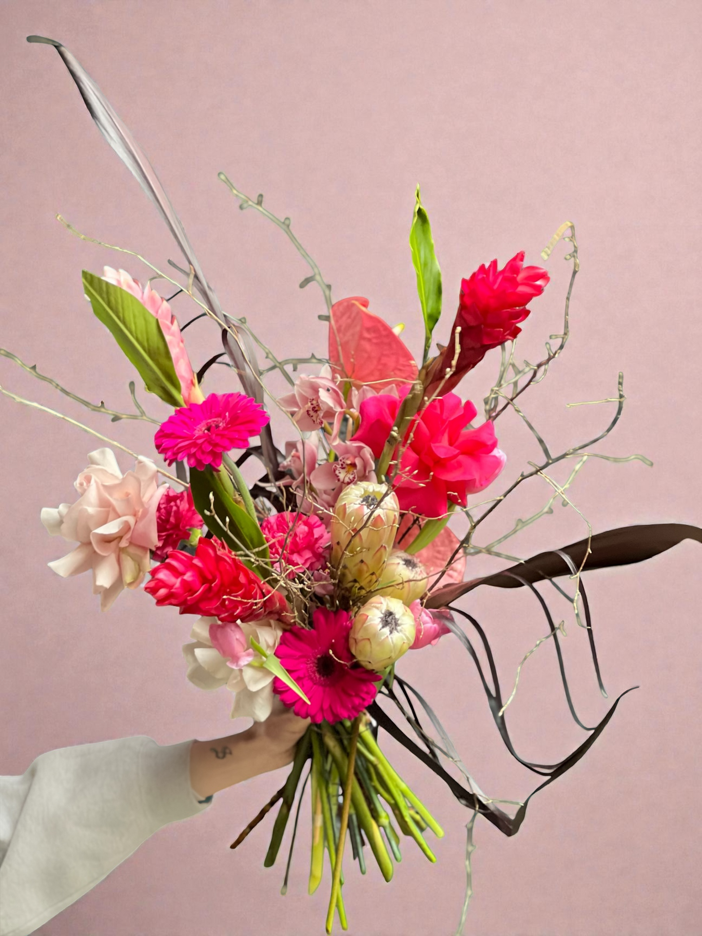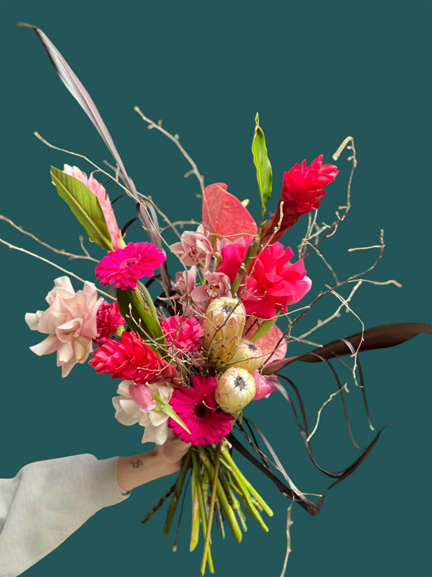 Wild at heart - Ingwer, Cymbidie, Gerbera, Protea, Anthurium, Rose, Zweige